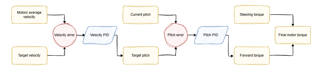 This setup is enough for the robot to stand in place and move forward or backwards. To enable turning, we simply add torque to one motor and subtract the same amount from the other.